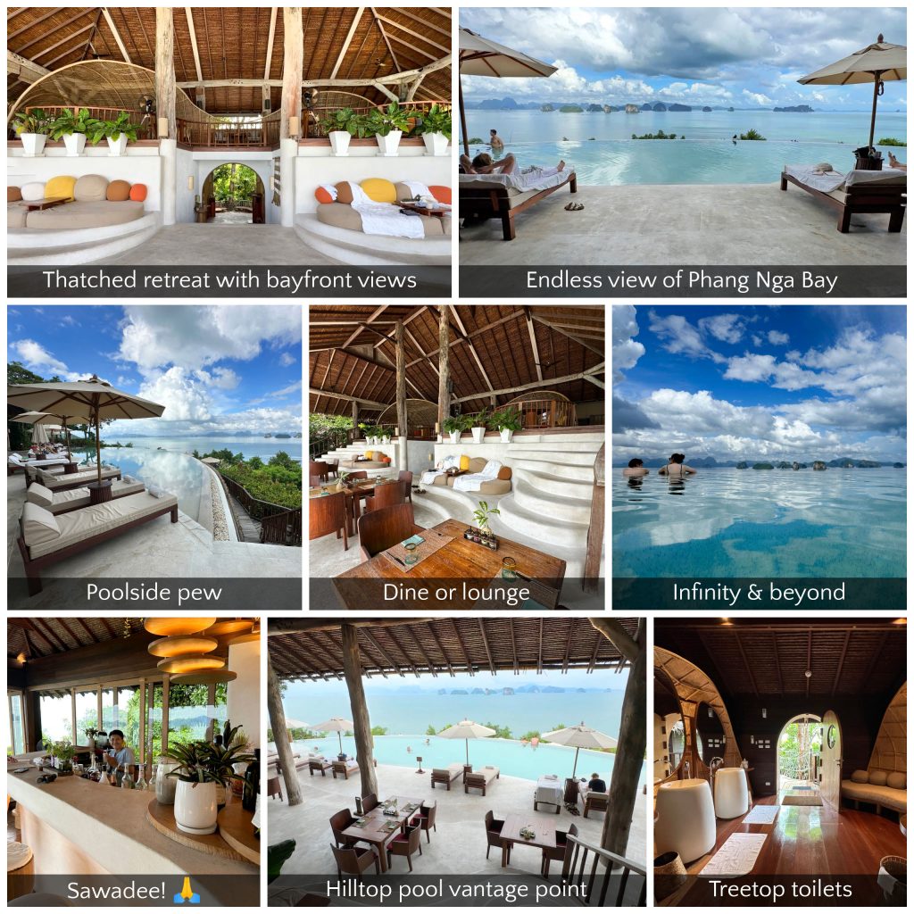 If the view from the Hilltop pool overlooking Phang Nga Bay isn’t the most delightful landscape I’ve ever seen, then it’s most certainly up there in the top five. By the pool is an under thatched roof structure – perfect for cover on those wet days! but also a welcome place to escape the sun. The hanger size building is a tasteful retreat offering chilled comfy seating overlooking the bay. The infinity pool is suitably insta friendly and we spent many hours on top deck lapping up all that this vantage point had to offer.